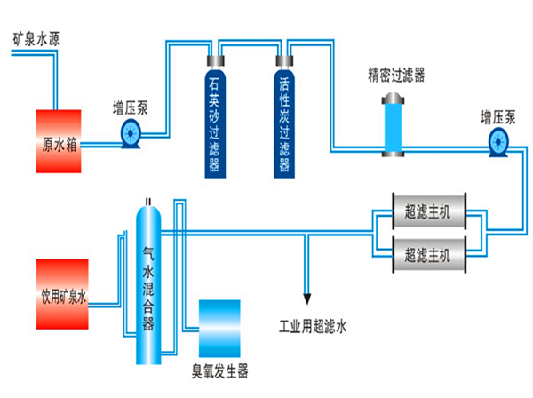 原水箱→原水增壓泵→機(jī)械過濾器→活性炭過濾器→1μm精濾→超濾主機(jī)→臭氧消毒→凈水箱→灌裝→成品