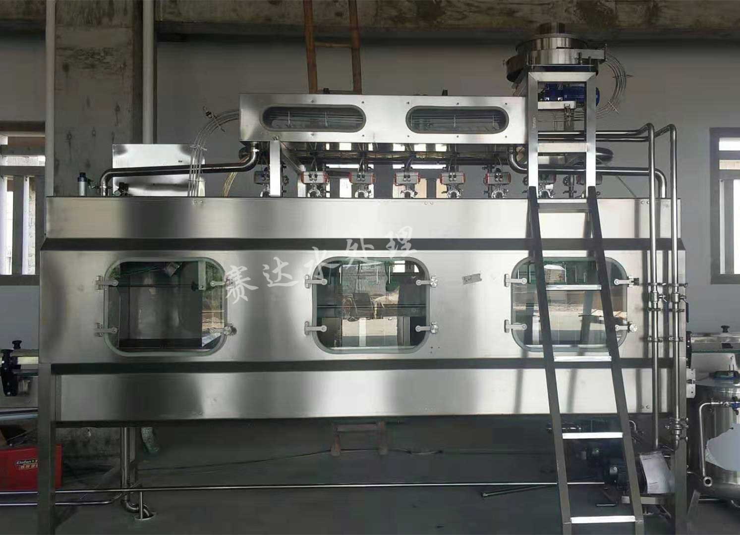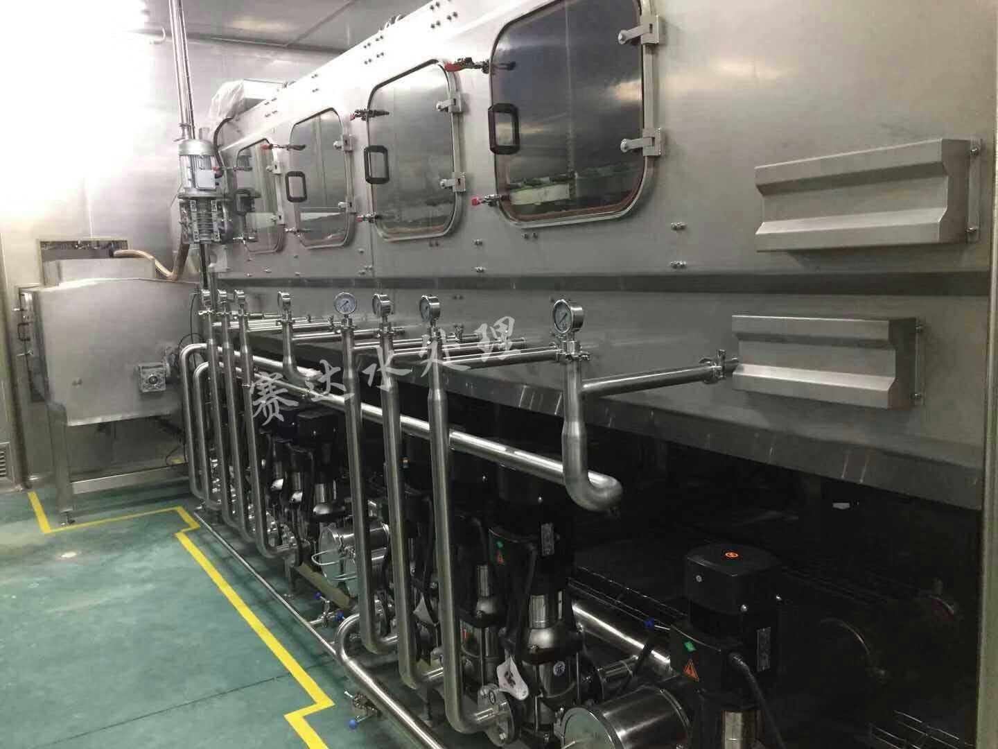 桶裝水灌裝機(jī)集消毒、沖洗、灌裝、封蓋于一體,其沖洗工位包括:熱堿液噴洗、、消毒液噴洗、道回用水噴洗、成品水噴洗、滴干等工位,具體根據(jù)用戶要求,做6-20個不同的沖洗工位。