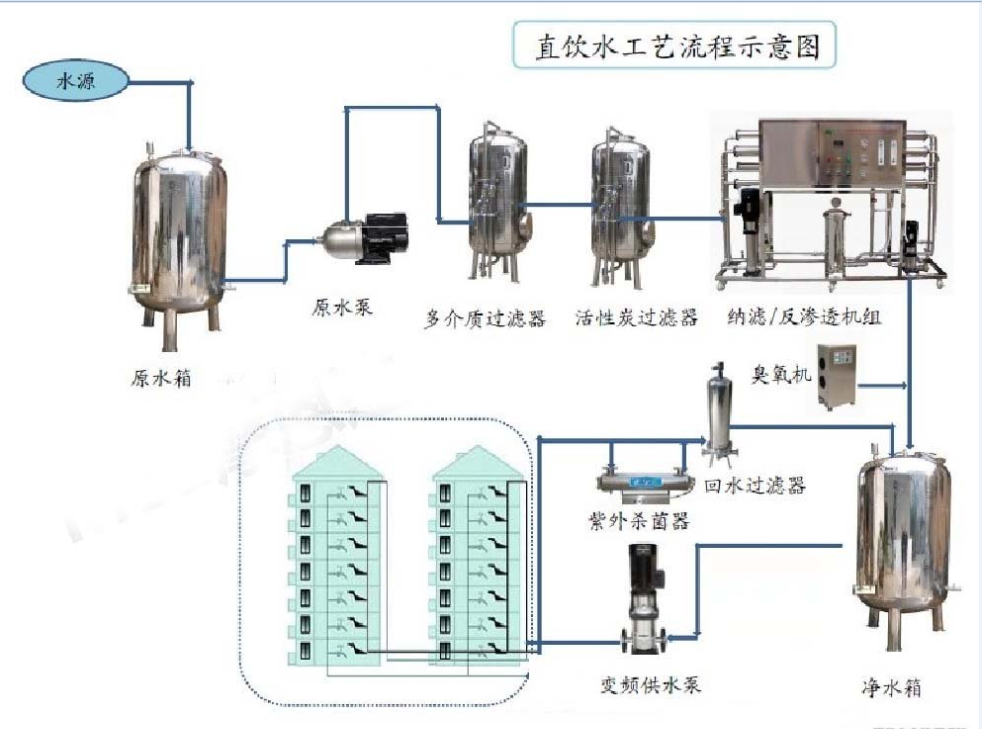 直飲水設(shè)備系統(tǒng)概述:直飲水系統(tǒng)是由原水箱、增壓?jiǎn)卧?、預(yù)處理單元、膜主機(jī)單元、循環(huán)供水單元、消毒單元、自動(dòng)控制單元、專(zhuān)用管網(wǎng)、專(zhuān)用水表、各式飲水終端等組成。